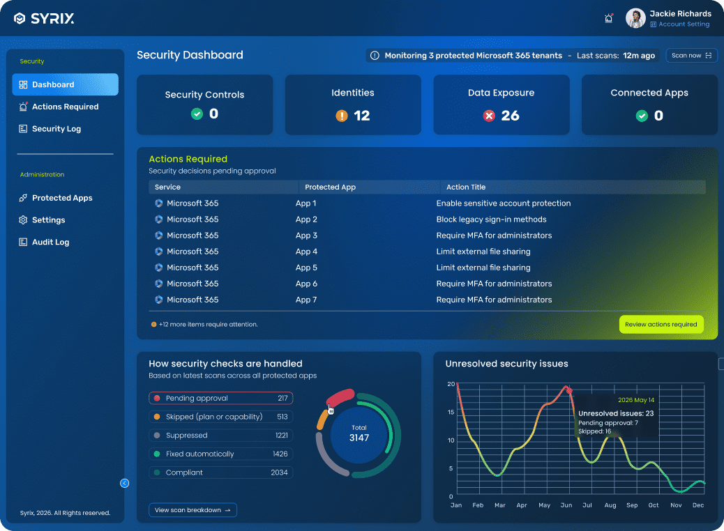 Syrix continuously monitors identity-related activity, revoking over-privileged access and blocking suspicious apps in real time.